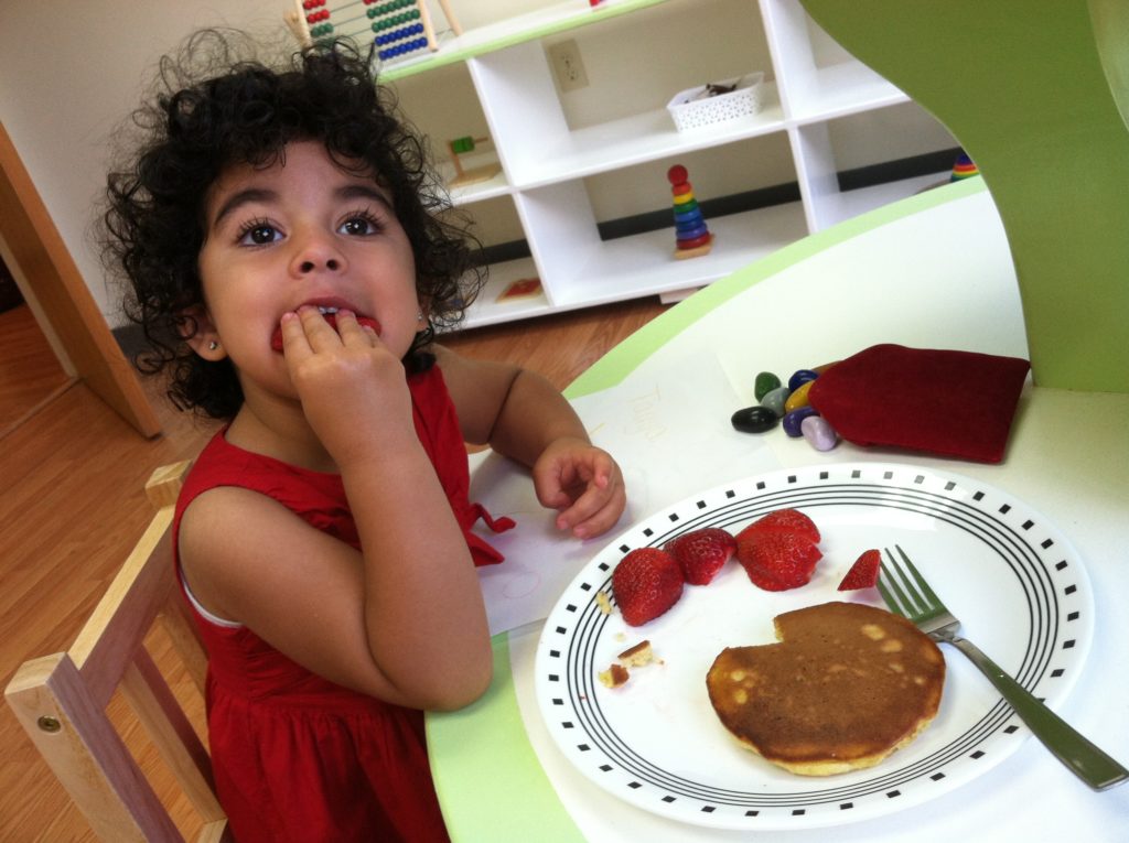 Our philosophy in preparing our meals and snacks is to use wholesome and fresh ingredients, buying omega-3 eggs instead of regular eggs. We freshly bake oatmeal with raisins or oatmeal with chocolate chip cookies for snacks which children are involved in preparing with the guidance of a teacher. We follow USDA guidelines in deciding the quality and quantity of our servings. serving two snacks a day, morning snack/breakfast of milk and cereal sometimes with raisins or bananas, hot oatmeal with raisins and cinnamon and waffles with honey and an afternoon snack that includes 2-3 food groups.