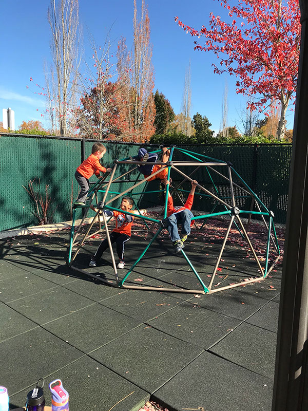Our school is equipped with a 3000 sqft yard, which we have utilized to create an outdoor active area for the children. The center of this play area is a bridge and tunnel combination, with an 8 ft long tunnel running perpendicular to a 16 ft long bridge. For active play, we have a dome climber on 2.5” thick green rubber tiles (rated for a 6 foot fall). A gazebo provides shelter from the sun or a light drizzle. Our shed is equipped with a range of outdoor toys including bicycles and tricycles for the children. We also have a play structure with a swingset and slide, sandbox, blocks etc. We add water play during summertime.